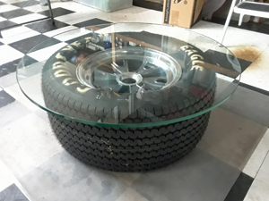 This a genuine Superformance front wheel with a new (too old to actually be run on a car) Goodyear Eagle tire. There is a custom cut glass top. The ideal coffee table for your Man Cave! $300 firm….